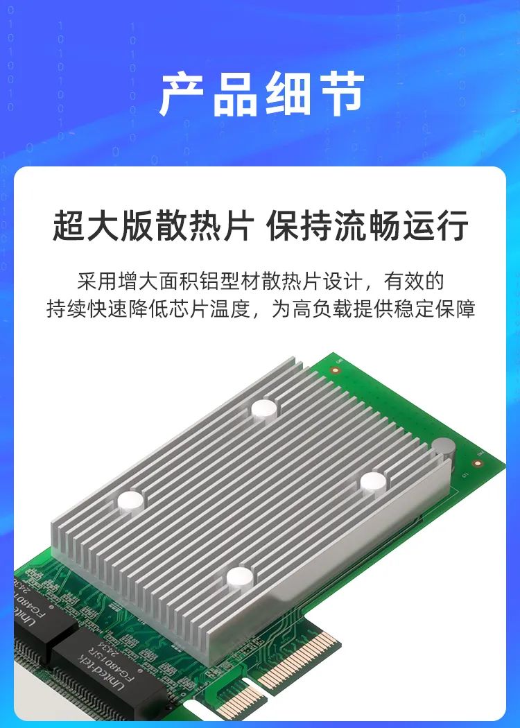 支持多種操作系統,包括Windows、Windows Server、Linux等,支持 PCIe x4插槽,同時兼容PCIe x8、x16通道。網卡結構設計支持全高和半高擋片,支持4U大機箱及2U小機箱安裝,產品廣泛運用于工業自動化、機器視覺、互聯網數據中心、云計算、大數據存儲、網絡安全等領域。