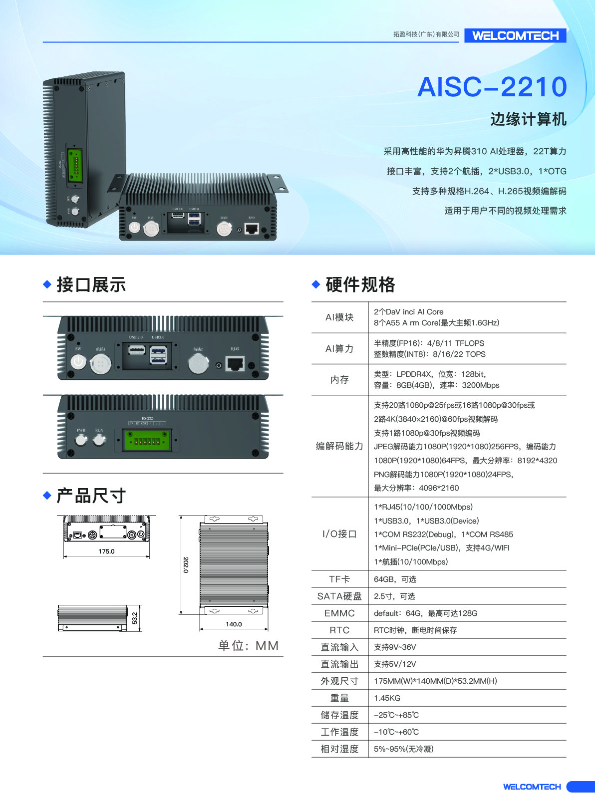 · 采用高性能的華為昇騰310 AI處理器,22T算力